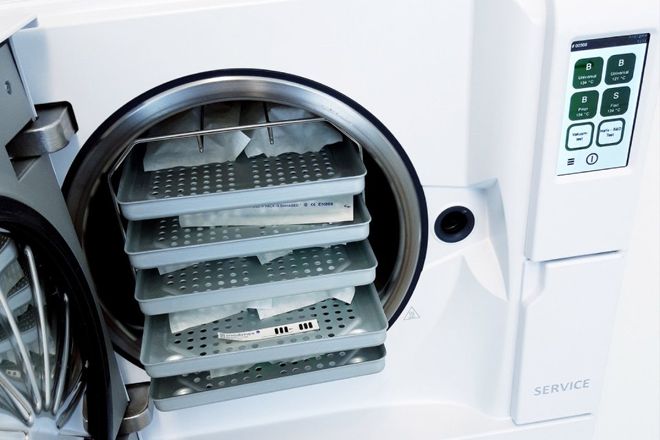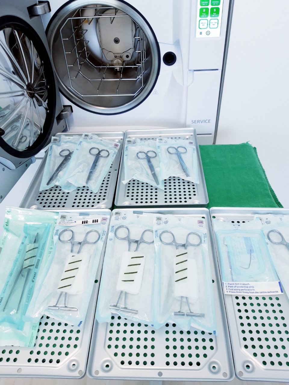 Nach Beendigung wird alles auf seine Funktion überprüft und mit sterilen Tüchern nachpoliert. Alles wird nun gezählt, nochmals überprüft und protokolliert. Erst dann werden alle einzeln in speziellen Sterilisationstüten verpackt, eingeschweißt und anschließend bei 134C° 10min sterilisiert. Nach Beendigung der Sterilisation kann man anhand des Kontrollausdruckes erkennen, ob alles korrekt sterilisiert wurde.