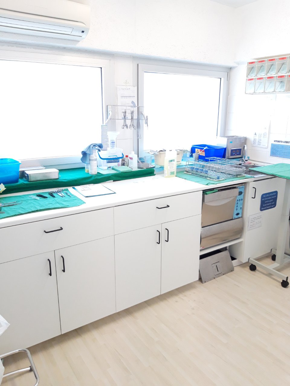 Dasselbe gilt auch für die Klienten; diese müssen vor Eintritt in den Behandlungsbereich Überziehschuhe und OP-Haube tragen, um das Infektionsrisiko dort zu vermindern.