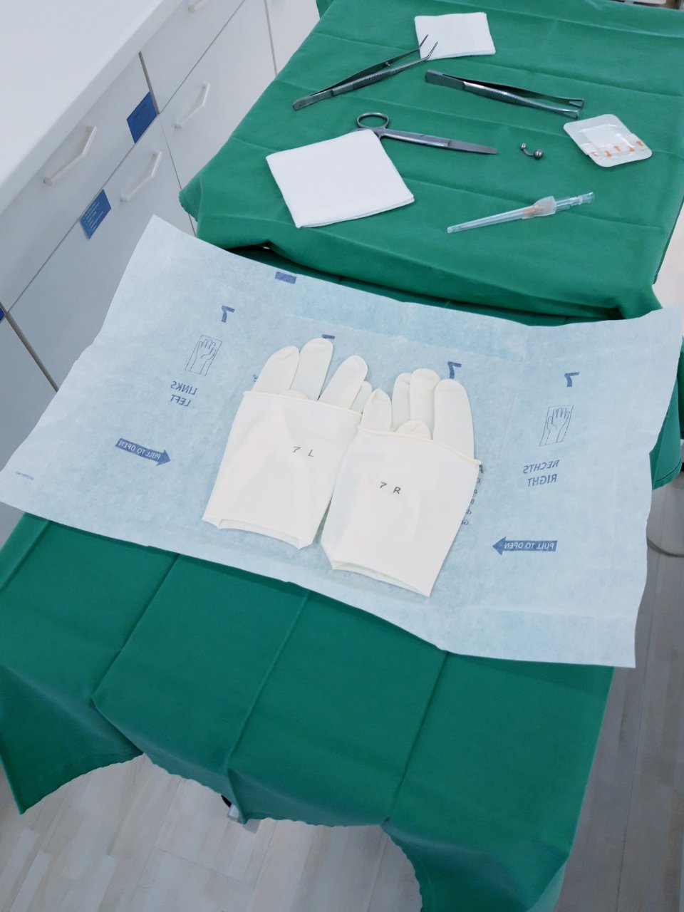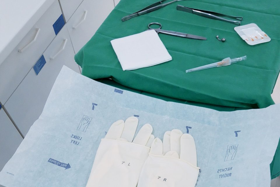 Für den Piercing-Eingriff kommen ausschließlich „sterile“ = keimfreie Produkte zum Einsatz! Darunter fallen z. B. Handschuhe, Tupfer, Abdecktücher, Instrumente, Wundverbände …